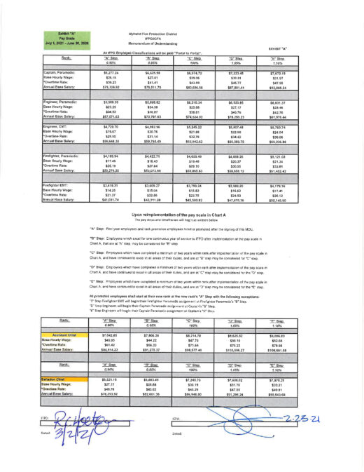 2021-2026: Captain paramedic annual salary from $75,326.92 to $92,066.24, Engineer paramedic annual salary from $67,071.63 to $81,976.44, Engineer EMT annual salary from $56,648.35 to $69,236.88, Firefighter paramedic annual salary from $50,279.25 to $61,452.42, Firefighter EMT annual salary from $41,031.74 to $50,149.90, Assistant chief annual salary from $84,514.23 to $108,681.58, Battalion chief annual salary from $78,253.92 to $95,643.68. See photo with the story for steps.